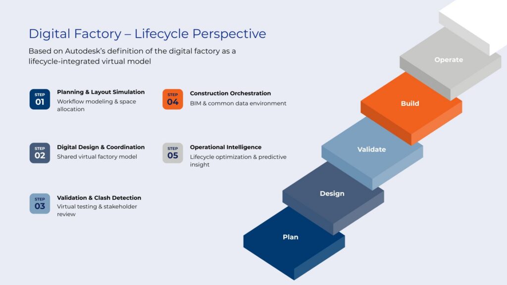 | Digital Factory | Lifecycle integration and governance | Overall architecture (Plan–Design–Build–Operate) | Orchestrate operational and modelling components coherently |